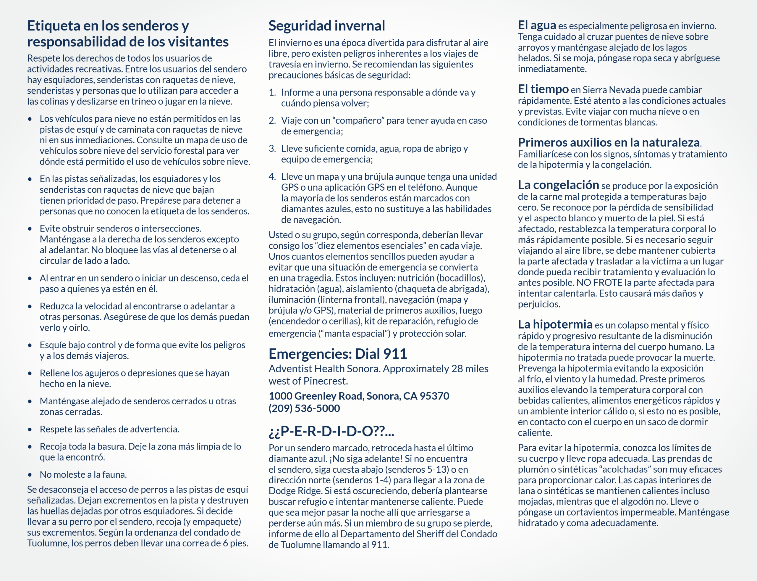 - Stanislaus National Forest – Summit Ranger District Pinecrest Ski Trails Map with a field photo mockup (Spanish Map) and Brochure and Inside & Outside, (Spanish: Inside & Outside)